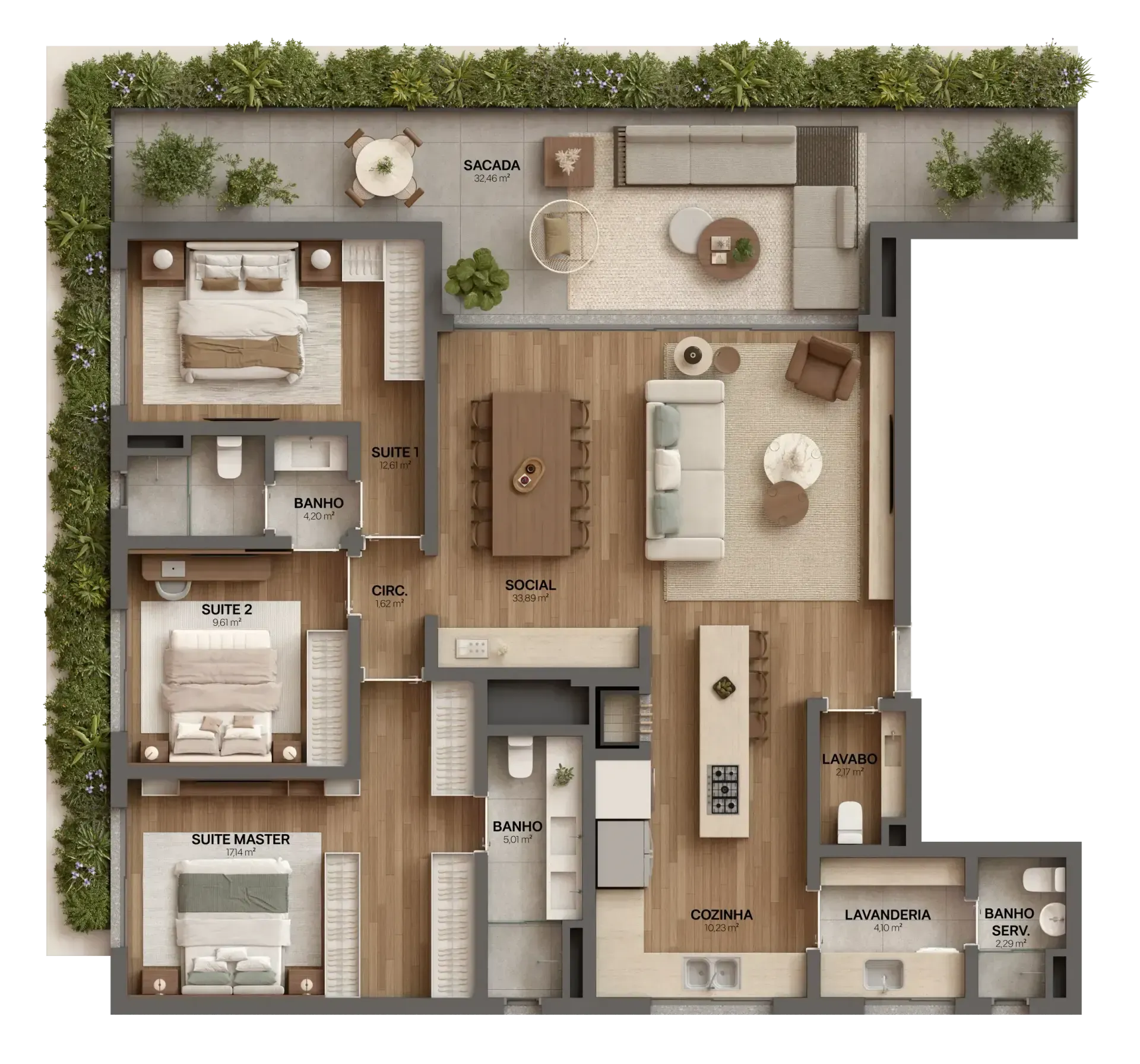 3 suítes, sendo 1 master e 2 americanas